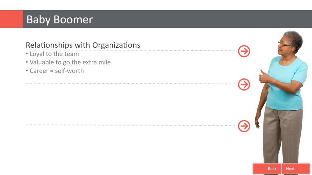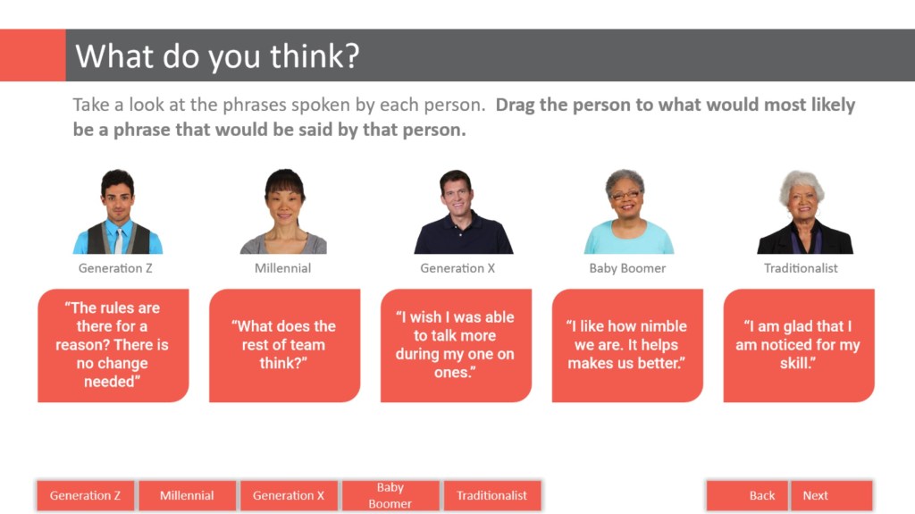 This is an Articulate Storyline project I worked on that explores the five generations that can be found in the workforce.